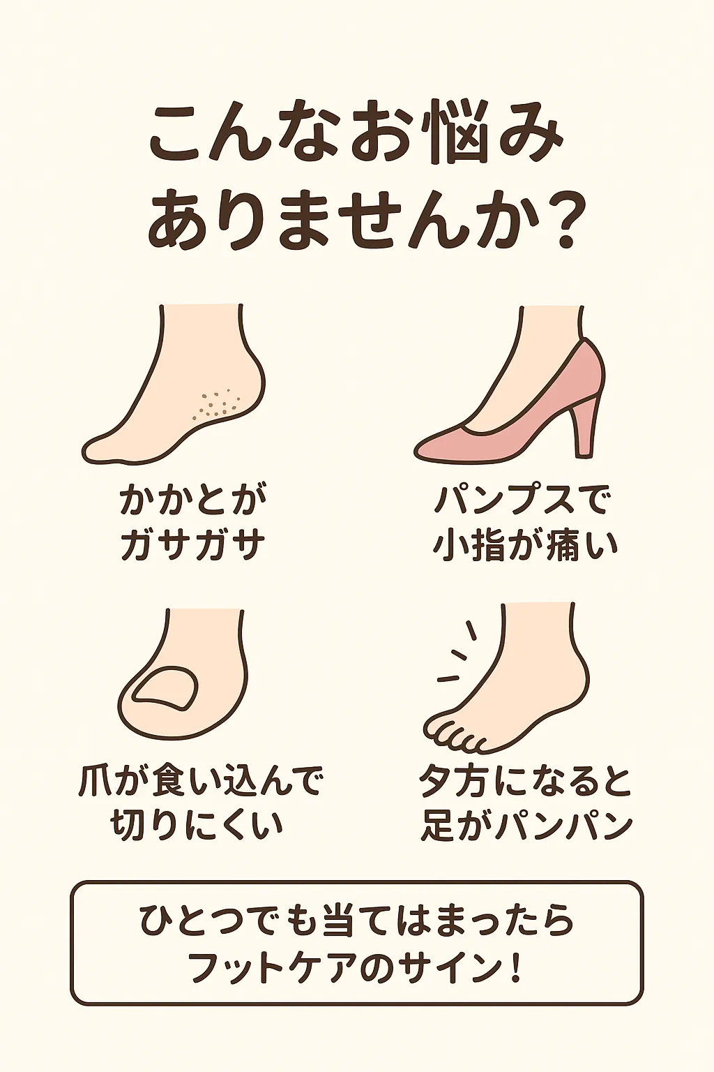 夕方になると足がパンパン… 毎日のお仕事・家事・育児。 パンプスや合わない靴での長時間立ちっぱなし・ 長時間座っていて足を動かさないなど、 女性の足を想像以上に疲れています。 ・かかとのガサガサ ・爪の食い込みや巻き爪 ・…